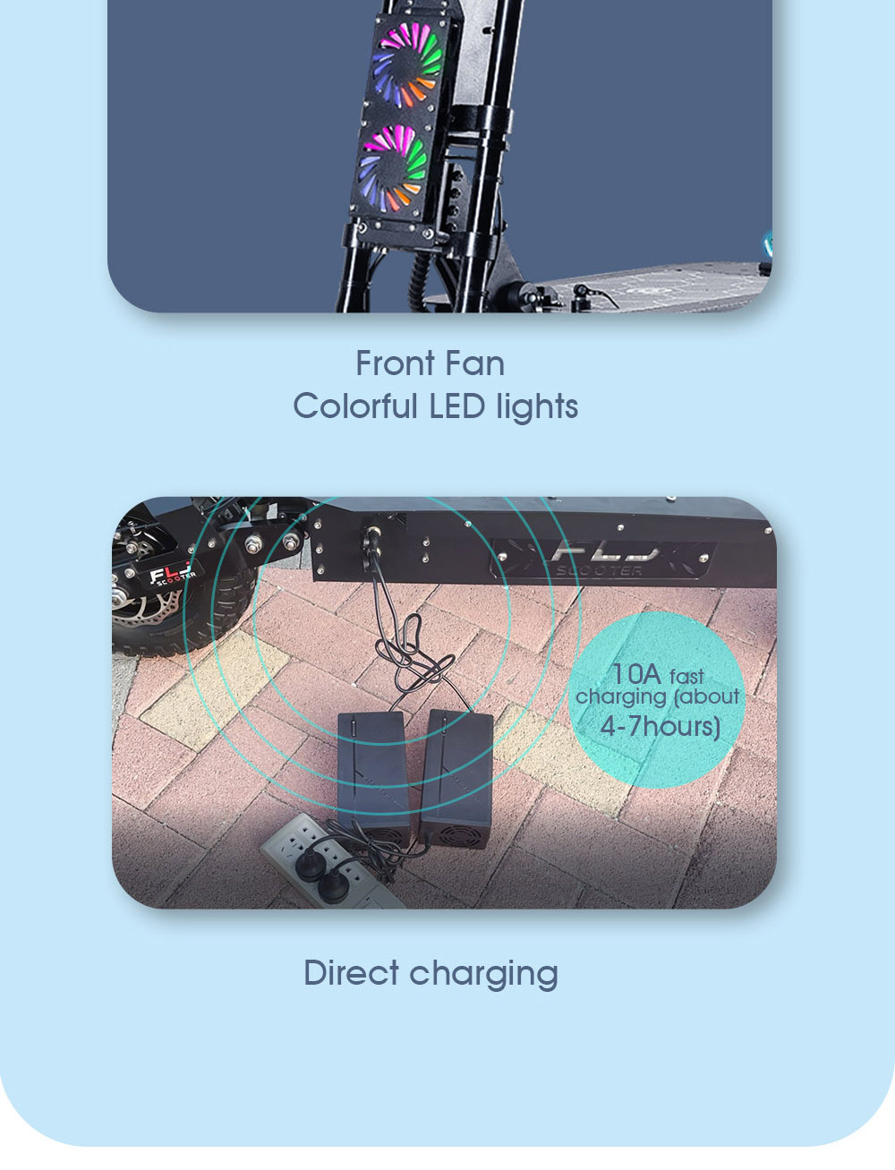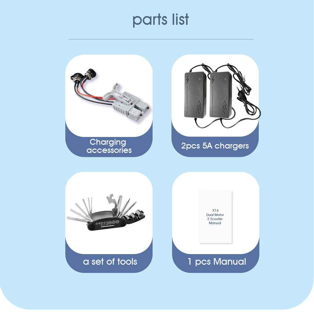 Battery : 35Ah / 50ah / 65Ah (Charger input 110V-240V ; Charger Output 84V/5A * 2) Charging Time : about 4-7 hours (10A fast charging) |