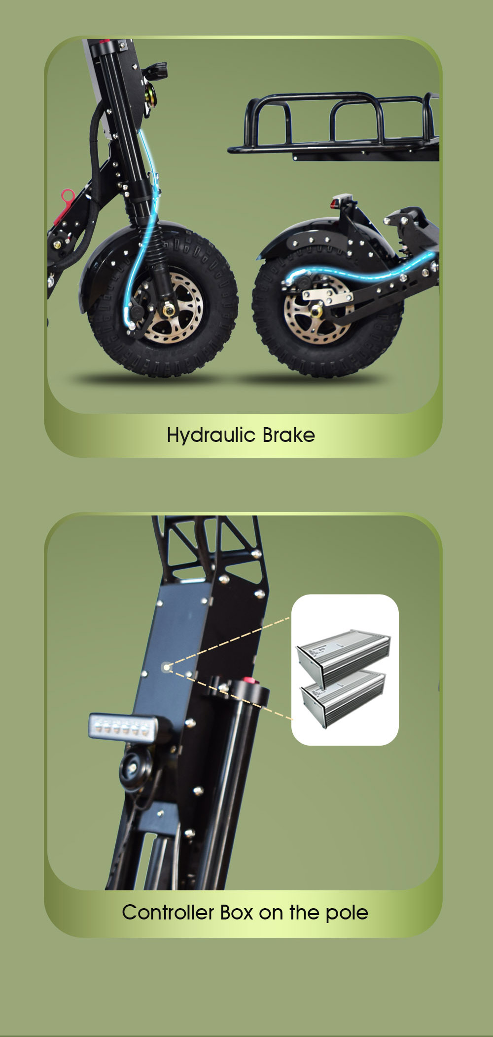 | -- With Short handle, good drive with seat -- With Acrylic Pedal Colorful LED Light -- with Front light Turn Signal + Rear light -- Controller in Handle, better waterproof and safe -- Aluminum Alloy frame -- Max Load : about 150kgs -- Net Weight: about 55-75kgs (not included seat; with set add about 2.5kgs) -- With Hydraulic front suspensions. -- With Hydraulic Brake(front+rear) |